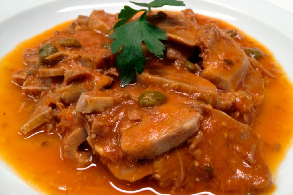Beef tongue stewed in a tomato sauce with capers. This dish is highly valued in Mallorcan home cooking, combining Mediterranean culinary traditions with the local love for pickled flavors.