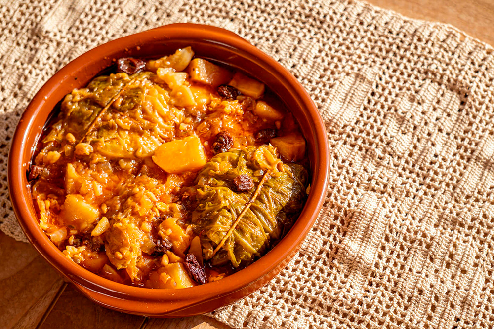 A traditional winter stew: cabbage rolls stuffed with pork, raisins, pine nuts, and two of the island’s signature cured meats—sobrasada and butifarrón. They are slowly simmered in a casserole until tender and full of flavor. This dish was originally created as a way for rural households to make the most of their ingredients.