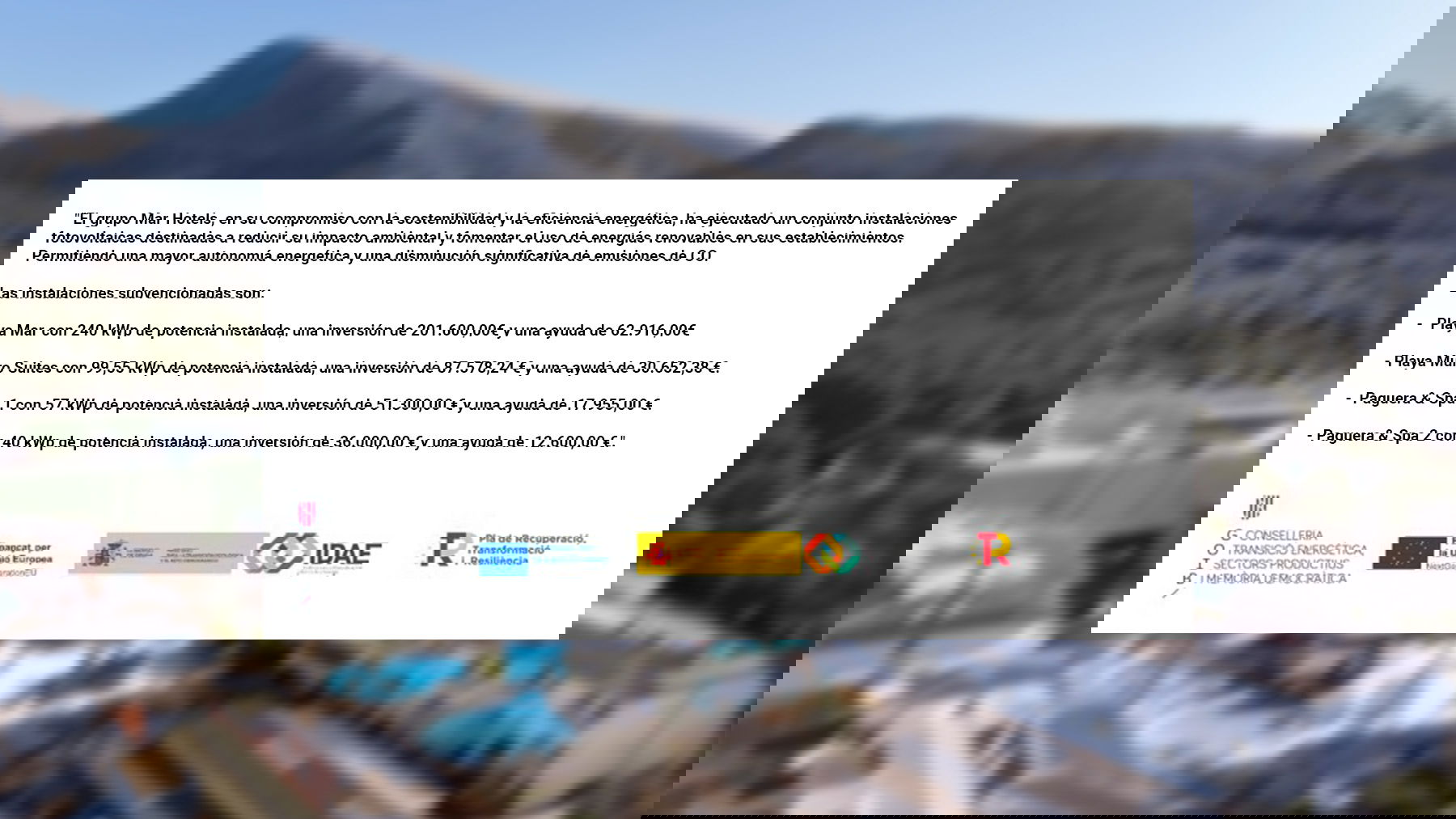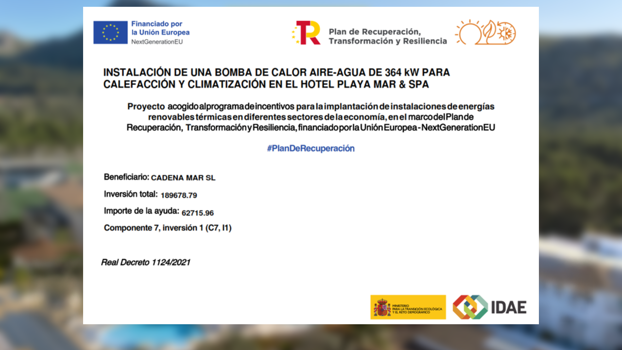 Renewable thermal installation (RD 1124/2021). As part of our commitment to reducing CO2 emissions and helping to slow down global warming, we have installed a new high-performance heat pump with heat recovery at Mar Hotels Playa Mar & Spa. The installation has been financed with Next Generation funds as part of the Recovery, Transformation and Resilience Plan, financed with European Union funds.